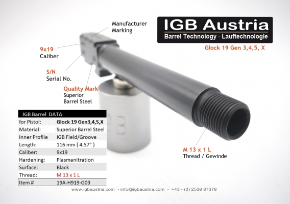 IGB Austria fertigt aus dem Vollmaterial Stahl bis zum Rohling und fertigen Produkt im Haus. Unabhängig von anderen Rohlingerzeugern, kann IGB die beste Stahlgüte einkaufen und im Haus verarbeiten. IGB bietet Läufe für ALLE Glockmodelle, für ALLE Generationen in jeder Länge und Ausführung.